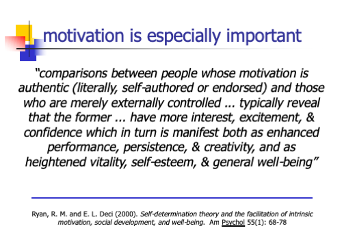 autonomous & controlled motivations:  This work on mindset overlaps, to an extent with research in Self-Determination Theory on the importance of 'Autonomous' rather than 'Controlled' Motivation ... see the next three slides below: