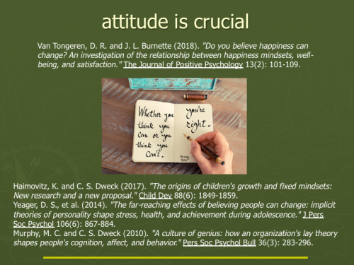 Working to respond more & more to challenges with a Growth Mindset makes great sense.  Here's a link to Professor Carol Dweck's very well know book "Mindset", here's one to an excellent associated website, and here one to a 10-minute TED talk by Carol on "The power of believing that you can improve".  These ideas can lead to wonderful changes, as illustrated in the resources I've just mentioned, or research papers like the deeply impressive 2018 studies "A single-session growth mindset intervention for adolescent anxiety and depression: 9-month outcomes of a randomized trial" or the very-relevant-for-our-wellbeing-course "Do you believe happiness can change? An investigation of the relationship between happiness mindsets, well-being, and satisfaction" with its abstract reading: "Three studies (N = 794) examined if beliefs about the malleable nature of happiness (growth mindsets) are associated with well-being and if this well-being had downstream implications for satisfaction with one’s relationships (Studies 1-3), health (Study 3), and job (Study 3). In Study 1 (N = 277), happiness growth mindsets were associated with greater well-being and greater relationship satisfaction. In Study 2 (N = 337), using an experimental paradigm and serial mediation, encouraging growth mindsets led to stronger beliefs in the changeable nature of happiness, which in turn was associated with subjective well-being, and, finally, relationship satisfaction. In Study 3 (N = 180), we replicated the downstream effects of growth mindsets of happiness on well-being and subsequently on relationship satisfaction and extended these serial mediation effects to health and job satisfaction. We discuss the implications of happiness mindsets."