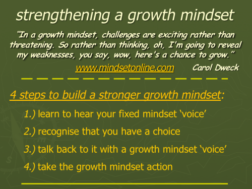 the importance of a growth mindset:  The quote at the start of this post makes a very important point - "Whether you think you can or think you can't, you're right".  Professor Carol Dweck is the researcher most linked with emphasising the importance of a Growth versus a Fixed Mindset.