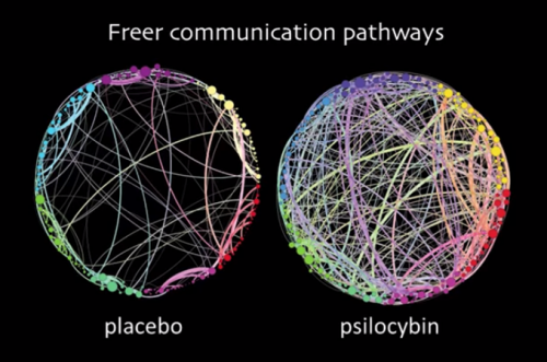 (imagery showing enhanced cross-communication in the brain from talk by Robin Carhart-Harris, TEDxWarwick 2016)