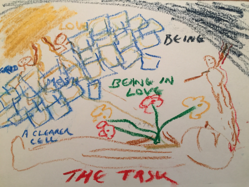 In trying to 'integrate' what happened, I've been using a number of methods - see the Lessons from current personal experience - suggestions" post for more on integration, dose, guides, and so on. One integration 'tool' I've used has been to draw each of the trips. Despite not being an artist at all, these drawings illustrate key points pretty well. Here's the drawing for the first trip: