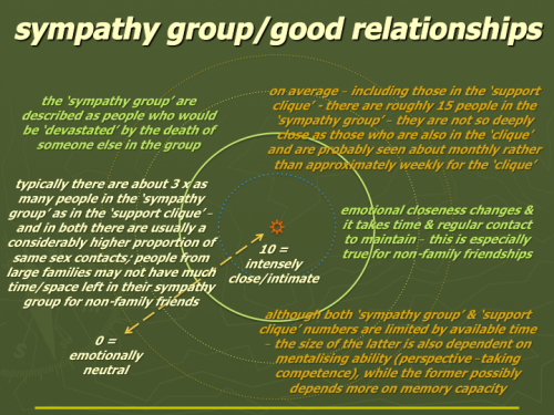I recently wrote Social networks: Dunbar's 5-15-50-150 model (support clique/closest relationships. I emphasised the huge importance of our social networks for improving life expectancy, protecting against psychological disorders, and boosting our happiness & wellbeing. What's not to like?! I went on to introduce Robin Dunbar's work and his layered model of personal social network structure. I then talked about the key inner support clique layer. Outside the support clique is the sympathy group or - stated possibly less awkwardly - outside our very closest relationships we have a layer of close relationships. If the support clique numbers very approximately 5 (including a possibly even more central 1-2), then the sympathy group (see the slide below) includes these 5 and adds approximately another 10 (0 to 30?!). As with all network layers, too few people in the layer can produce vulnerability, while too many tends to result in weaker emotional connections.
