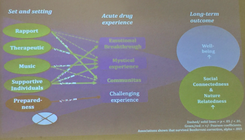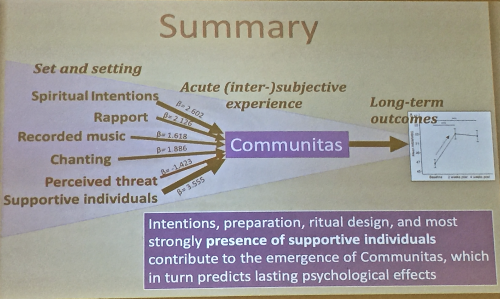 Hannes linked his talk to Victor Turner's concept of 'communitas' - "a state of equality, comradeship, and common humanity, outside of normal social distinctions, roles, and hierarchies" - see Turner's book "The ritual process: structure & anti-structure". Hannes' research explored the hypothesis that ... in addition to participants' subjective reports of, for example, mystical-type or emotional breakthrough experiences ... "Intersubjective experience (Communitas) during ceremony contributes to increased psychological well-being and social connectedness". Four weeks post-ceremony was a key endpoint for measuring these positive changes, although there were also more immediate (e.g. day after) and more delayed (e.g. at 6 & 12 month) assessments. Communitas during the ceremony itself was measured using an 8-item scale developed from earlier research studies on this variable. (Here's a copy of the Communitas Scale (as a PDF file & as a Word doc) illustrating the questions used). As you can see from the Summary slide below, greater levels of group Communitas lead to better outcomes. Communitas was particularly contributed to by the presence of supportive individuals, spiritual intentions, and rapport, while chanting, music and a low sense of threat also helped.