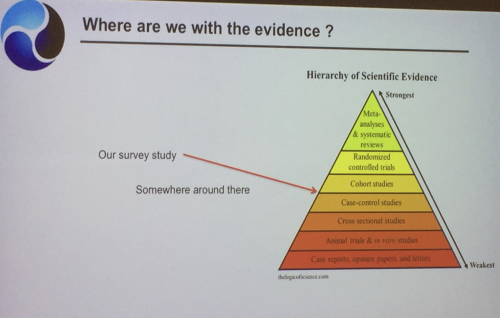 I think this is really interesting but, as quite often seems to happen in the psychedelic field at the moment, there appears to be some lack of awareness of other broader psychotherapy findings. I do wonder why this Ceremony study used a variable like 'Communitas' when there is already overwhelming evidence that 'Cohesion' so strongly contributes to therapeutic outcomes in groups. The slide below, taken from David Erritzoe's talk on microdosing, illustrates the usefulness but relative weakness of evidence from survey data like the Psychedelic ceremony study.
