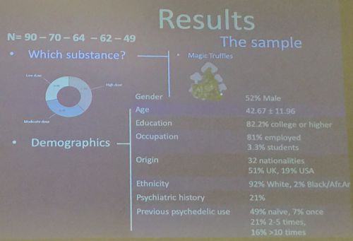 The very warm-hearted & experienced Ciara Sherlock (a co-director & lead facilitator) then spoke more practically about the UK Psychedelic Society Experience Retreats. There have been 50 or so of these retreats run since 2016, with over 600 people taking part. I'm due to go on one myself in October, so it was good to hear more about them. Here's an excellent half hour YouTube film - "Mind explorers: A psychedelic weekend" - giving more insight into what the retreats involve. Then Laura Kaertner spoke on "The ceremony study - findings from the experience retreats". Online notes stated "The presentation will focus on how individual traits (e.g. personality) and variables pertaining to set and setting shape the acute experience. Furthermore, they aim to identify aspects of the acute psychedelic experience (e.g. emotional breakthrough, insight) that shape long-term responses to ritualised psychedelic use; focusing on the effects on general well-being, feelings of connectedness and nature-relatedness, political perspectives and metaphysical assumptions." The talk was interesting and helpful. As I'm going on one of these UK Psychedelic Society Retreats in October, it was useful to have some idea of possible participant details: