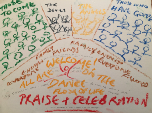 In trying to 'integrate' what happened, I've been using a number of methods - see the Lessons from current personal experience - suggestions" post for more on integration, dose, guides, and so on. One integration 'tool' I've used has been to draw each of the trips. Despite not being an artist at all, these drawings illustrate key points pretty well. Here's the drawing for the first trip: