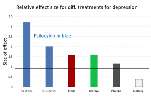 Here's a slide (below) from an earlier 2016 talk by Robin Carhart-Harris. These effect sizes merely indicate that something interesting & encouraging seems to be going on. Small unblinded, open-label studies done by treatment developers typically produce better results than later large, double-blind studies. However the patients Robin is reporting on here all suffered from treatment-resistant depression. It's very unlikely that medications, therapy or placebo would produce the high effect sizes shown in the slide for this difficult to help population.